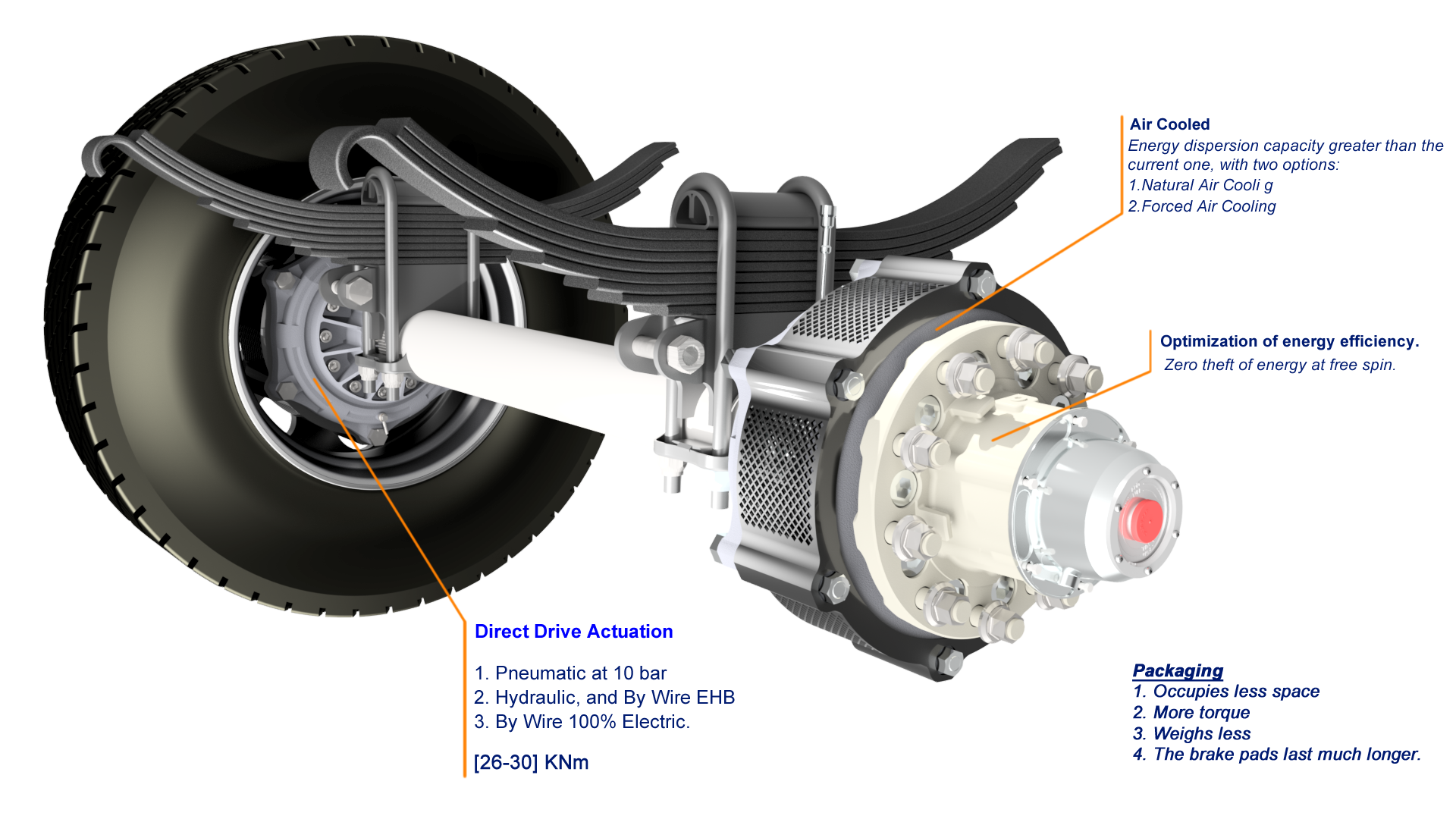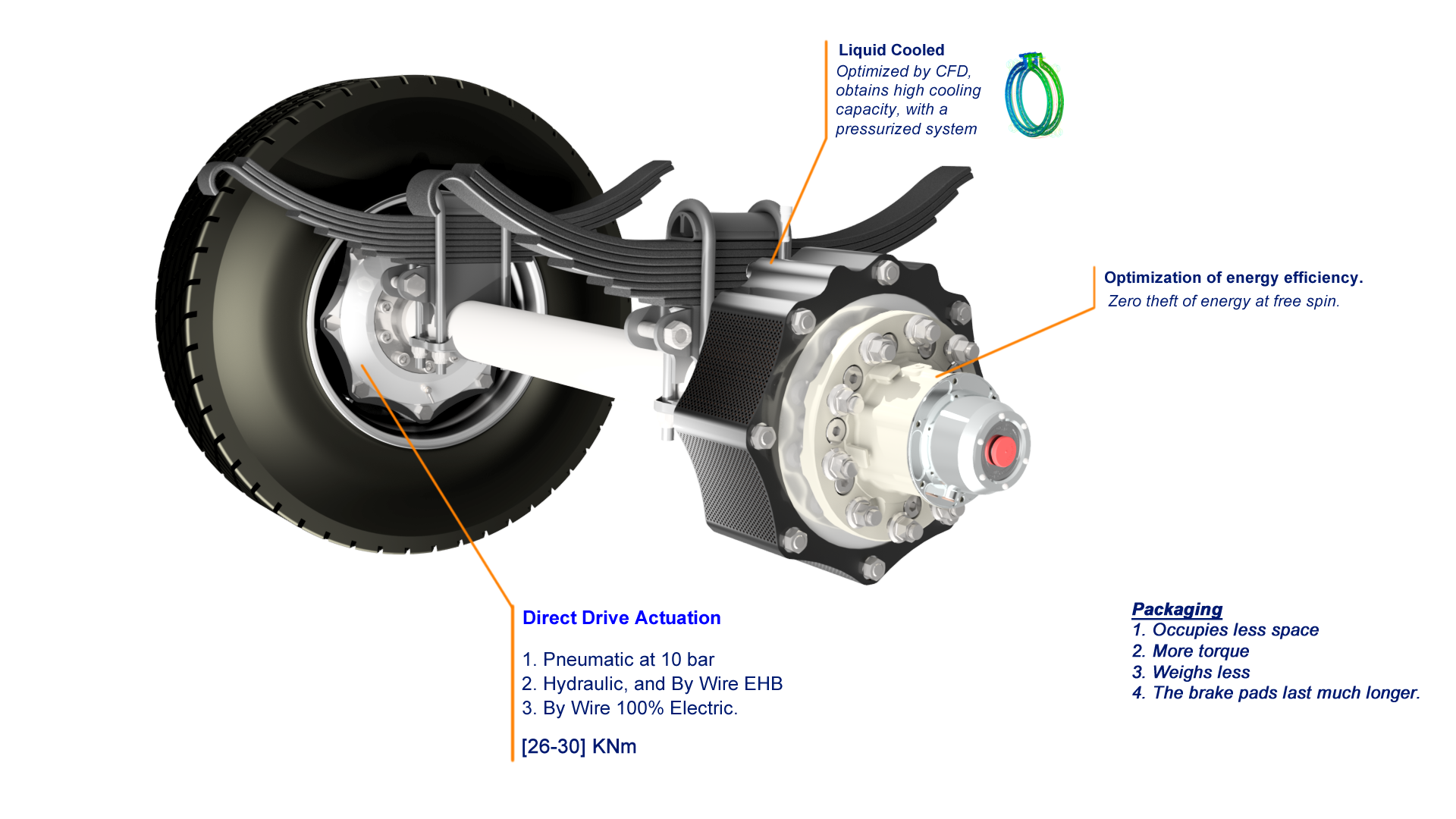 This new and very efficient «Brake Concept» is applicable to any wheel that, while in rotation, needs to be braked. It provides great advantages from a perfomance, packaging, technical, industrial and economic perspective.